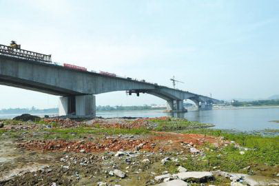 为确保工程质量,施工方采用悬挂浇筑的方式,从每个桥墩之间相向一截一截浇筑至合龙。岷江特大桥共有中跨合龙段6个,边跨合龙段4个,按照先边跨,后中跨的原则安排合龙顺序进行了合龙。
