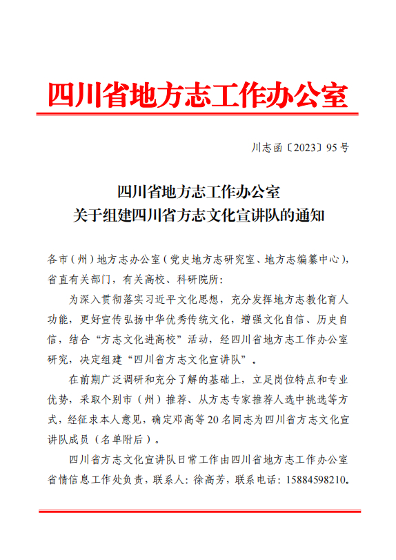 为深入贯彻落实习近平文化思想,充分发挥地方志教化育人功能,更好宣传弘扬中华优秀传统文化,增强文化自信、历史自信,2023年10月23日,四川省地方志办组建四川省方志文化宣讲队。