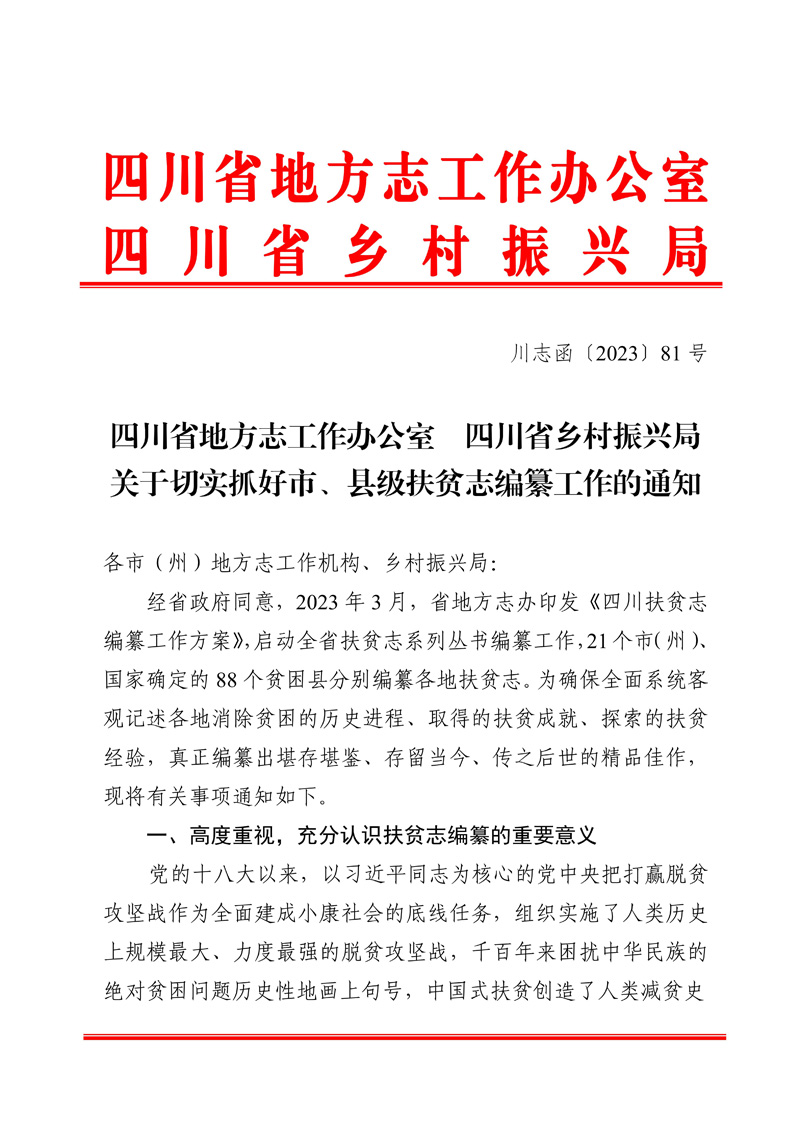 党的十八大以来,以习近平同志为核心的党中央把打赢脱贫攻坚战作为全面建成小康社会的底线任务,组织实施了人类历史上规模最大、力度最强的脱贫攻坚战。为贯彻落实中央领导同志重要批示精神,忠实记录中国共产党领导全国各族人民推进扶贫取得的举世瞩目辉煌成就和全面建成小康社会伟业,2022年3月,中国地方志指导小组印发《关于实施中国扶贫志编纂工程和中国全面小康志编纂工程的若干意见》,就编纂扶贫志、全面小康志作出部署。2023年3月,经省政府同意,四川省地方志工作办公室印发《四川扶贫志和全面小康志编纂工作方案》,规定除编纂省本级扶贫志外,21个市(州)及国家确定的88个贫困县分别编纂各地扶贫志,成都市编纂全面小康志。自编纂工作启动以来,四川各地党委、政府高度重视,精心安排部署,各级地方志部门主动担当作为,认真履职尽责,有序推进编纂工作。