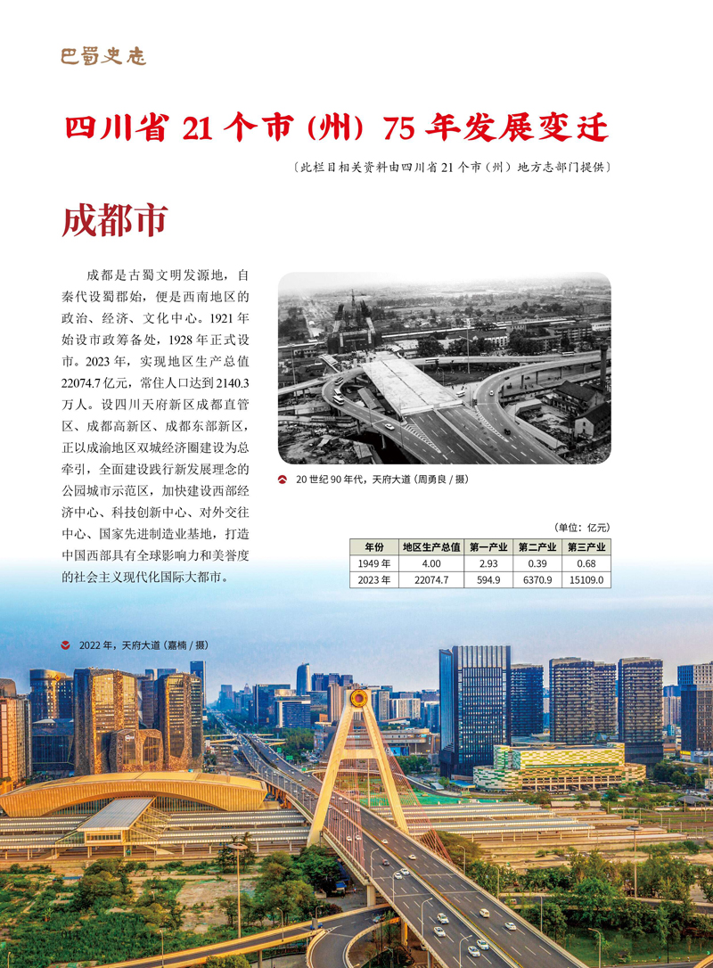 本期专刊设7个栏目。“蜀地春秋”栏目,通过数据解读75年来四川经济社会发展取得的巨大成就,以地区生产总值数据和城乡面貌影像照片新旧对比方式,全景式展现全省21个市(州)75年来的历史变迁与发展成就。“战略引领”栏目,回顾国家实施三线建设、西部大开发和新时代实施成渝地区双城经济圈建设等一系列重大战略的重大意义,四川取得的辉煌成就和积累的宝贵经验。“蜀业新篇”栏目,真实记录四川水利建设、发展新质生产力、建设更高水平“天府粮仓”、打造国际一流航空枢纽、参与“一带一路”等产业发展的实践与成果。“蜀韵新声”栏目,聚焦三星堆、古蜀道、三苏文化、非遗传承、成都大运会,梳理地方志记载四川75年的发展历程与光辉成就,展现四川文化事业繁荣发展景象。“蜀乡新颜”栏目,突出反映四川在脱贫攻坚、乡村振兴中取得的历史性成就和老百姓衣食住行的巨大变化,描绘了大熊猫主题公园、成都市城市建设的多彩风貌,多角度展现中国式现代化的万千气象。“蜀中人物”栏目,重点介绍世纪伟人邓小平,以及为社会主义革命、建设、改革事业作出突出贡献的张力行、马识途等人物的光辉事迹。“华诞颂歌”栏目,以诗歌、散文形式,赞颂美丽家乡,描绘时代画卷,深情抒发爱党爱国情怀,展现巴蜀儿女奋进新时代的无限豪情。