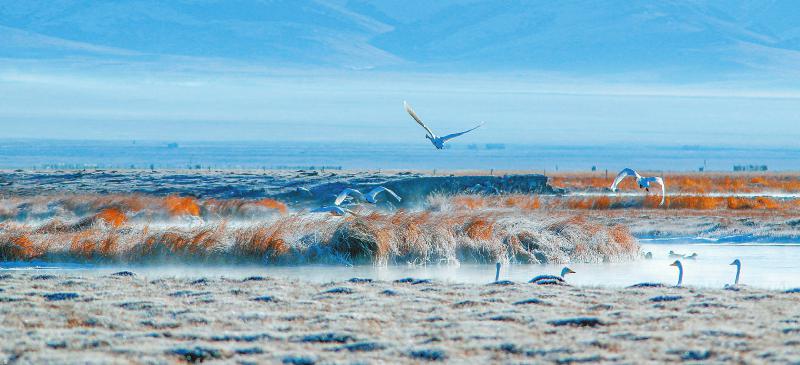 大天鹅在若尔盖草原湿地越冬嬉戏。贡波泽里 摄