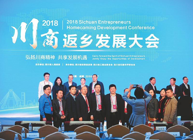 2018中外知名企业四川行活动于4月17日启幕。去年活动期间,我省与国内外投资者签订投资额3000万元以上的正式合同750个。截至今年3月,签约项目履约率为90.53%、开工率80.53%、投产率30.8%。图为参加2018川商返乡发展大会的嘉宾在合影留念。(记者 肖雨杨)