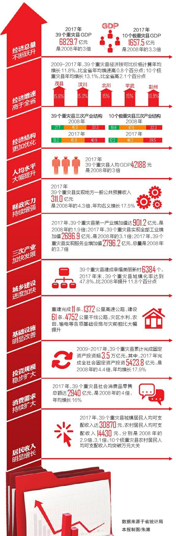 这一轨迹与全省经济总量变化基本一致,却始终略高于全省。2017年,全省实现地区生产总值(GDP)36980.2亿元,是2008年的2.95倍左右。看灾区,2017年,39个国定重灾和10个极重灾县(市、区)的GDP分别是2008年的3倍和3.3倍。