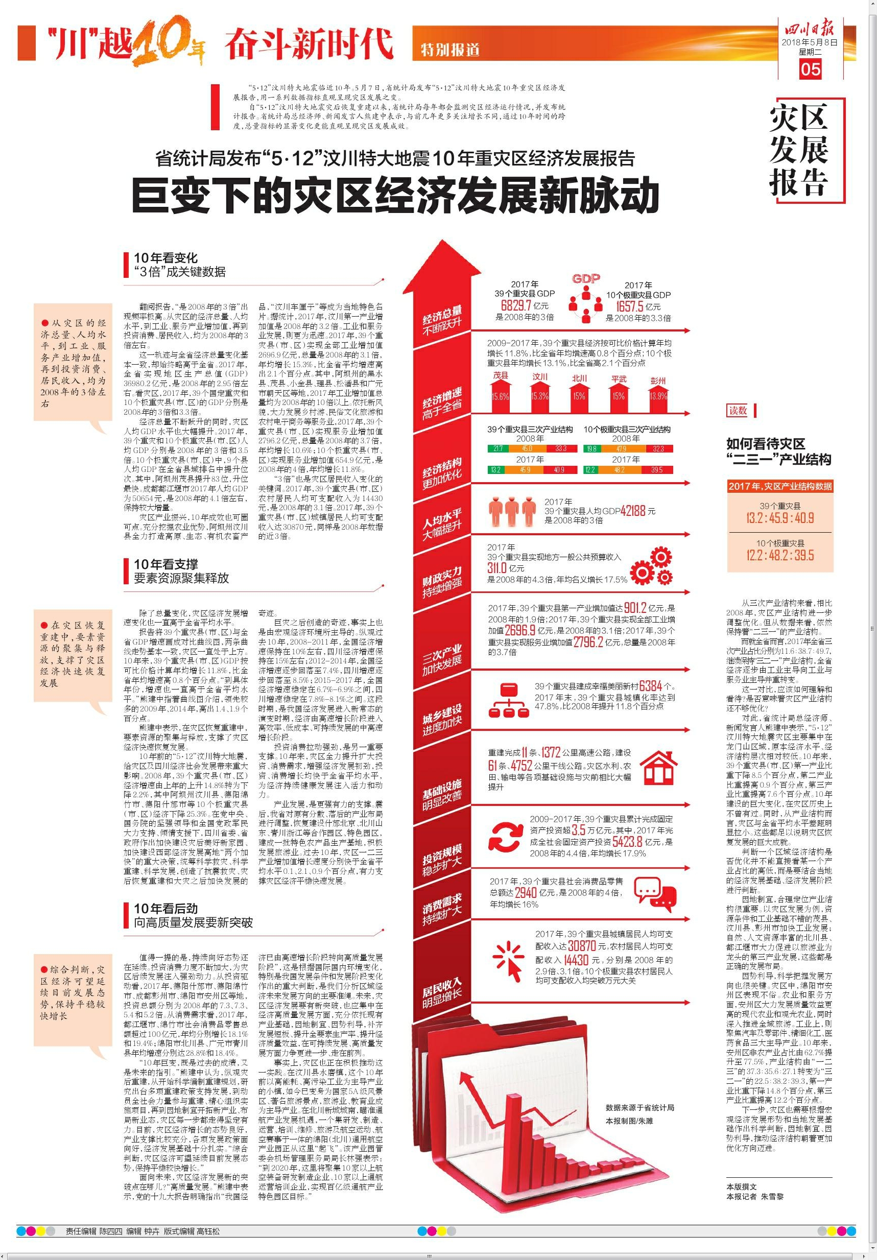 “5·12”汶川特大地震临近10年。5月7日,省统计局发布“5·12”汶川特大地震10年重灾区经济发展报告,用一系列数据指标直观呈现灾区发展之变。