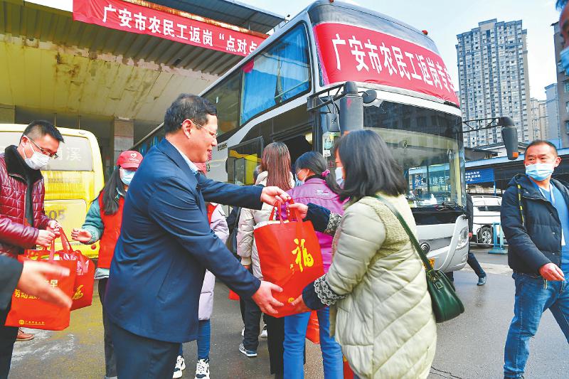提供交通便捷服务,畅通务工往返路。每年春运前后,全省各地都会组织开通农民工返乡返岗专列(专车),并在车站、码头等地,开设农民工购票服务窗口。疫情发生以来,累计开行农民工返岗专车4.8万辆、专列(厢)123趟、包机57架,“点对点”运输农民工107.77万人。