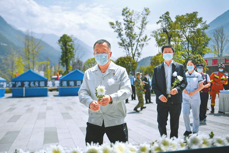 9月12日中午,在石棉县城北民族团结广场,救援部队、医护人员、基层干部、志愿者和基层群众代表敬献鲜花,表达对地震遇难同胞的哀思。记者 杨树 摄