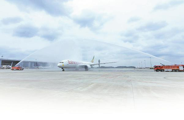 3月26日14时35分,从埃塞俄比亚首都亚的斯亚贝巴起飞的ET636次航班,降落成都天府国际机场。该航班是天府机场首架抵达的洲际航班。记者 韦维 摄