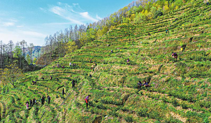 来自浙江的帮扶人员(左)与青坪村茶农一起采摘鲜叶。记者 何海洋 摄