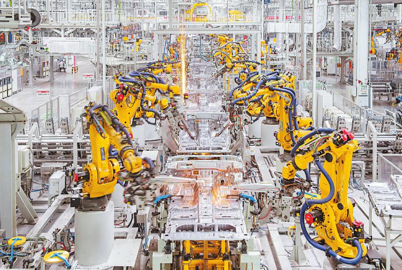 凭借川渝强大的产业链、供应链和物流链,45家整车企业、1600多家配套商,构建起一个“你中有我、我中有你”的产业集群,全域自主配套率超过80%,整体竞争力大幅提升。图为长城汽车重庆市永川生产基地,生产线上的焊接机器人正在作业。