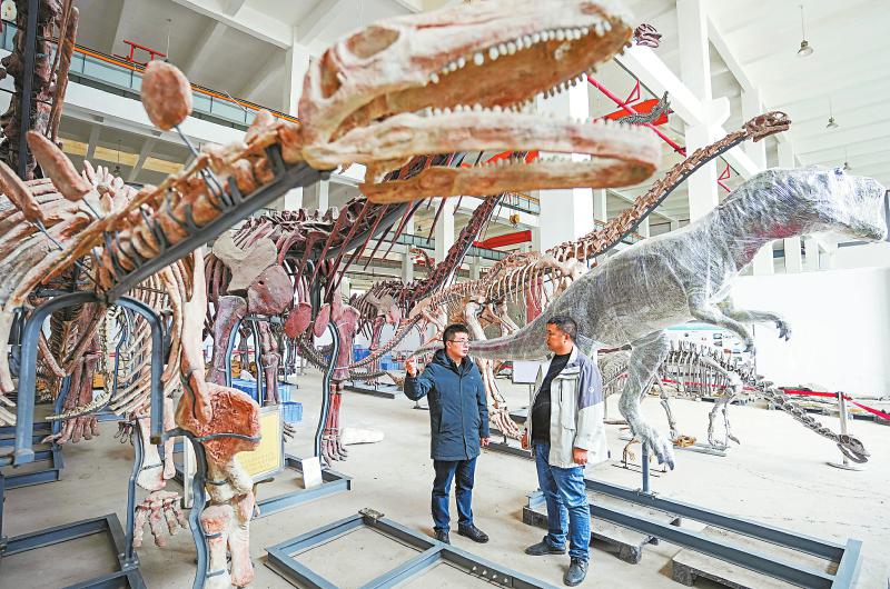 2023年2月20日,川渝共建古生物与古环境协同演化重庆市重点实验室,实验室主任代辉(左)正在谈论修复还原恐龙的问题。