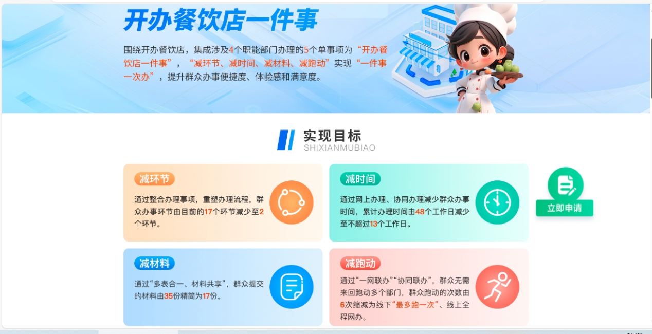 (五)强化跨部门办事事项融合,上线“高效办成一件事”服务专区。该专区聚合了14项个人、企业高频热点事项的办事服务信息,着力打造我省“一件事”线上服务统一入口。主要有两个方面的特色创新:一是展现形式更新颖,通过图像、动画、文字等方式多样化展示办事指南,让企业群众“一看就懂、一键能办”;二是办理模式更优化,将原串联办理事项转变为并联办理,实现“一单告知、一表申请、一套材料、一窗(站)办结”,办件高效性就此体现出来。以“开办餐饮店一件事”为例,申请表单要素从100个压减到58个,“一件事”申请材料由35份压缩为17份,办理时限由48个工作日压减为13个工作日,真正实现了让“数据多跑路、群众少跑腿”。