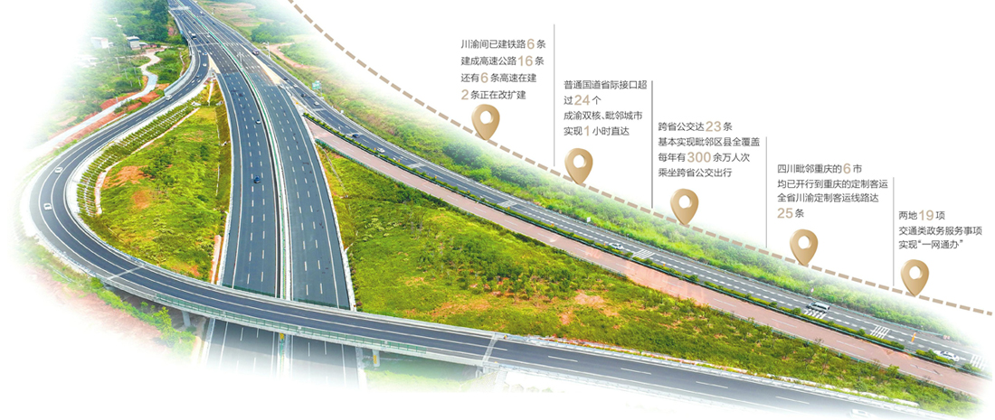 推进“软联通”,两地19项交通类政务服务事项实现“一网通办”,高频事项“超限运输通行证”和“道路运输经营许可证”电子证照实现川渝两地亮证互认。从出行到服务,两地交通的一体化日益深入。