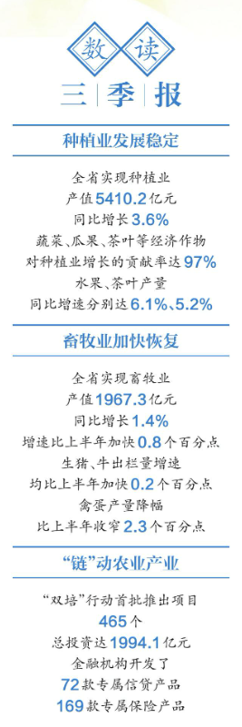 总体看,前三季度粮食和经济作物较快增长,畜禽生产加快恢复,林业和渔业加快崛起,全省农业经济呈现稳中向好态势。