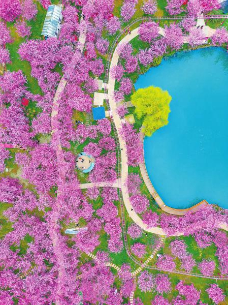 3月8日,成都市新都区漫花庄园里的粉樱全面盛开,春色满园,繁花似锦。