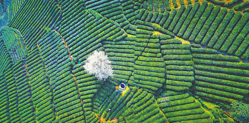 3月2日,峨眉山市寨子村的高山茶园翠绿一片,茶田里的樱桃花盛开如雪。