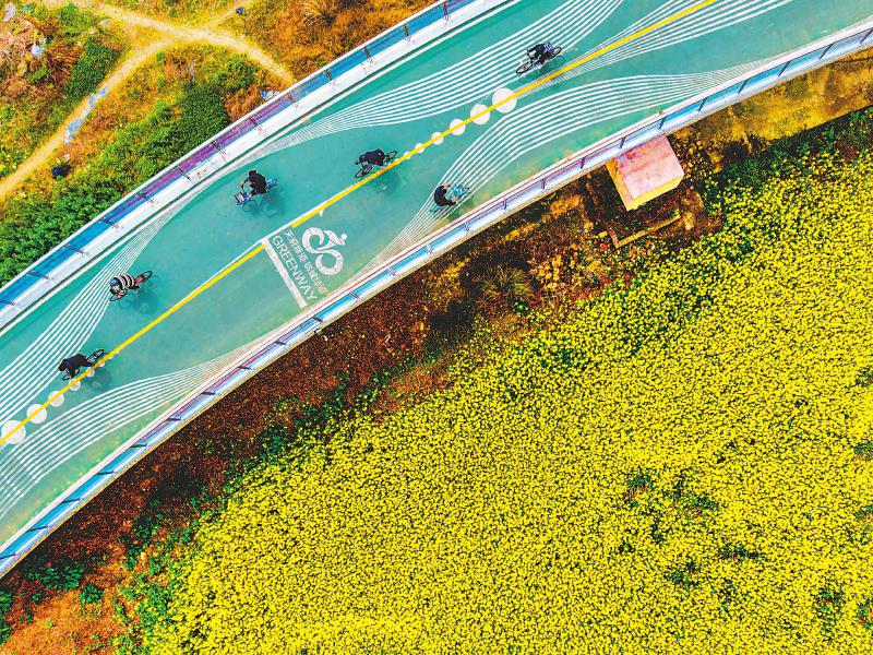 3月23日,市民在成都环城生态绿道上骑行,赏尽春光。