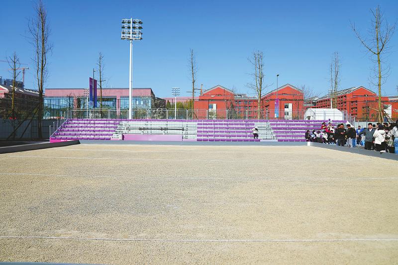 从游泳馆的一侧步行几分钟就能到达地掷球场地。该场地的核心比赛区域是一个17米×18米的方形区域,场地内铺满了碎砂石,小金属球落在上面会小幅度沉落,不会向四周滚动。“赛事方一开始送来的砂石样本是克罗地亚的海砂,需要远距离运输,经过和赛事方反复沟通,最终选择了能提供相同比赛条件的乐山砂石。”王金阳说。