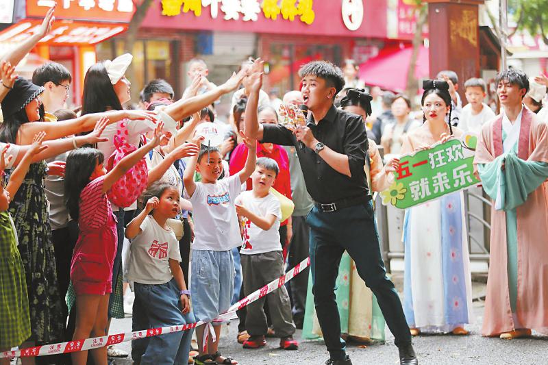• 5月3日,在乐山市上中顺特色文化街区,游客观看文化快闪节目表演。李华时 摄(C视觉)