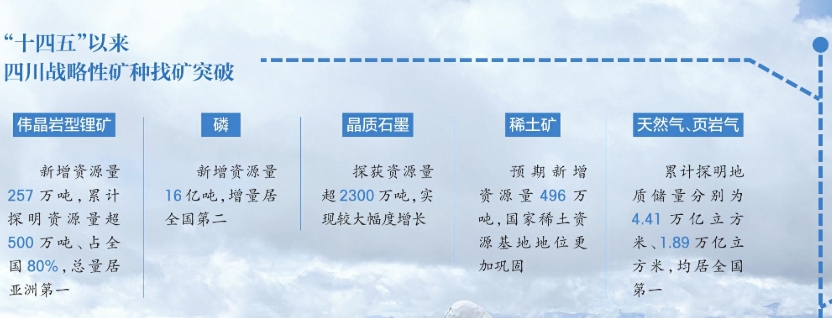 自国家启动新一轮找矿突破战略行动以来,四川以改革方式纵深推进找矿行动,实现了一系列重大突破,持续增强矿产资源保障能力。“十四五”以来,四川锂、稀土、金、油气等矿种资源储量大幅增加,优势战略性矿种找矿突破和增储上产成效显著。