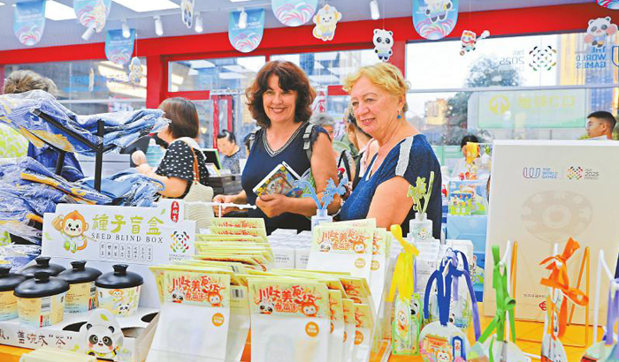 7月28日,成都市红星路上的世运会官方特许商品零售店里热闹非凡,中外游客在此选购纪念品。李天祥 摄(C视觉)