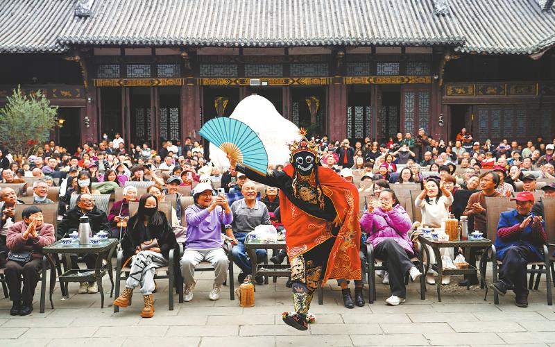 2月23日,2026年德阳孝泉镇“上九会”开幕,武圣宫里川剧变脸艺人在进行表演。唐渝川 摄(C视觉)