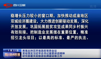 5月12日,省委副书记、省长黄强主持召开省政府第70次常务会议,贯彻落实习近平总书记重要讲话精神和近期党中央国务院重要会议精神,研究部署“十四五”区域规划和专项规划编制、“天府旅游名牌”建设等工作。