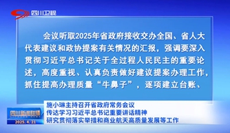 4月21日,省委副书记、省长施小琳主持召开省政府第47次常务会议,传达学习习近平总书记近期重要讲话精神,研究贯彻落实举措和商业航天高质量发展、支持创业带动就业等工作。