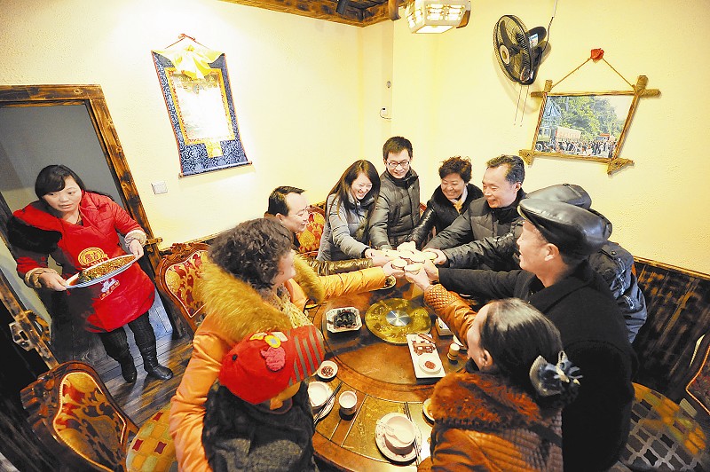 2月12日,主要经营茶楼和餐饮的汶川县渔子溪村“渔家大院”吸引了不少游客前来休闲娱乐。