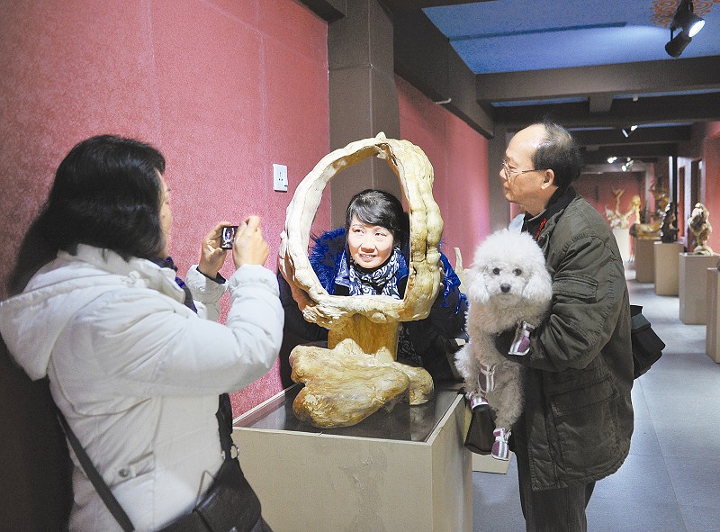 2月12日,大年初三,众多游客来到汶川县映秀镇映秀东村非物质文化遗产主题文化创意园游玩和参观。图为游客们在参观藏族根雕。