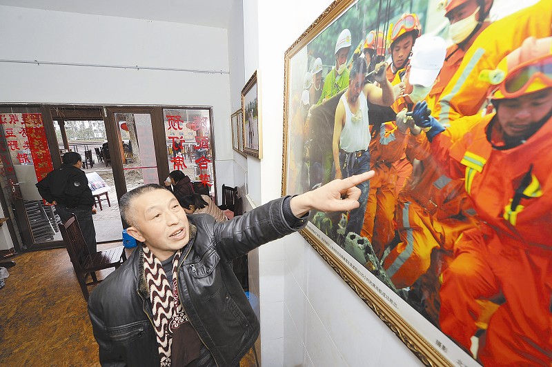 震中饭店老板杨云青说,这幅挂在墙上的自己参与“5·12”抗震救灾的照片已成为饭店最好的招牌。
