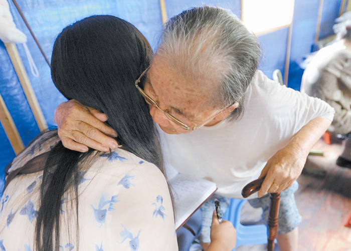7月28日,本报记者在芦山县龙门乡采访中,90岁老太太黄玉珍一把抱住记者,连声说:“感谢你们的关心!”(记者 余坪 摄)