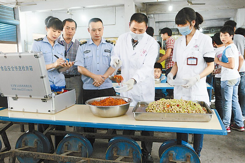 9月26日,广安市广安区食品药品监管局与公共卫生人员对“疑似有毒的食品”进行现场取样和快速检测。当日,广安区在石笋中学举办了重大食品安全事故应急演练。