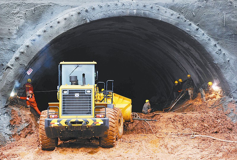 在国道351线上的佛图山隧道中,工人们正加紧施工。351线起于宝兴县两河口,经芦山县飞仙关在天全县乐英乡与今后的雅康高速公路相连,建成后,宝兴与芦山之间的车程将从目前的一个半小时缩短到40分钟内。