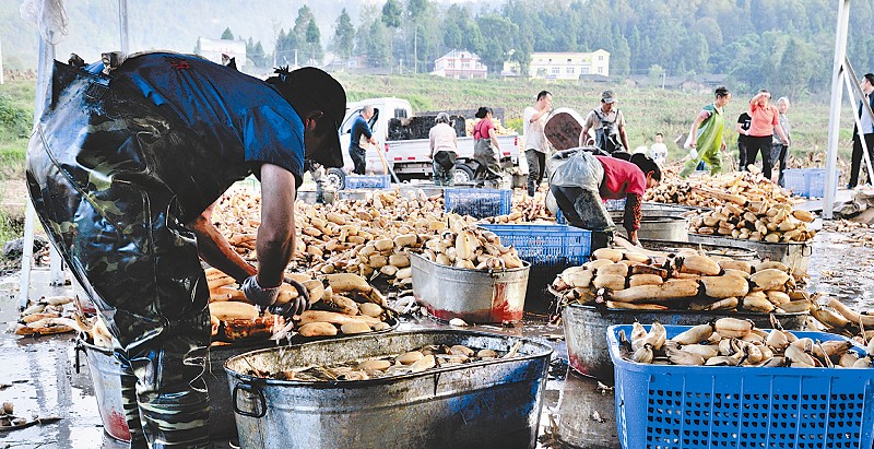 产业发展帮助巴中村民增收致富。图为柳林镇七颗石村莲藕基地组织村民采藕。