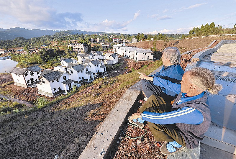 两位村民在高处观看漂亮的巴山新居。夏雨摄