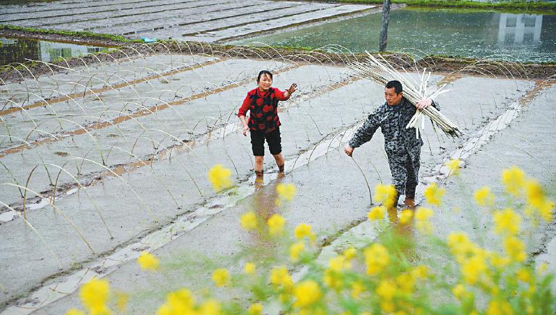 谋新 正值春耕,多地农村引入耕种新技术。图为南充市高坪区胜观镇胜观桥村村民陈金、唐菊华夫妇在秧母田里安插竹片,准备覆盖保温地膜。成潮生 摄(视觉四川)
