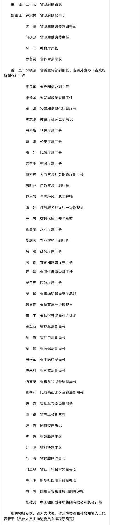 根据实施意见,成立健康四川行动推进委员会,是统筹推进健康四川行动组织实施、监测和考核的关键。记者了解到,此前,四川省人民政府办公厅关于成立健康四川行动推进委员会的通知已经下发,以省政府副省长王一宏为主任的健康四川行动推进委员会宣布成立。