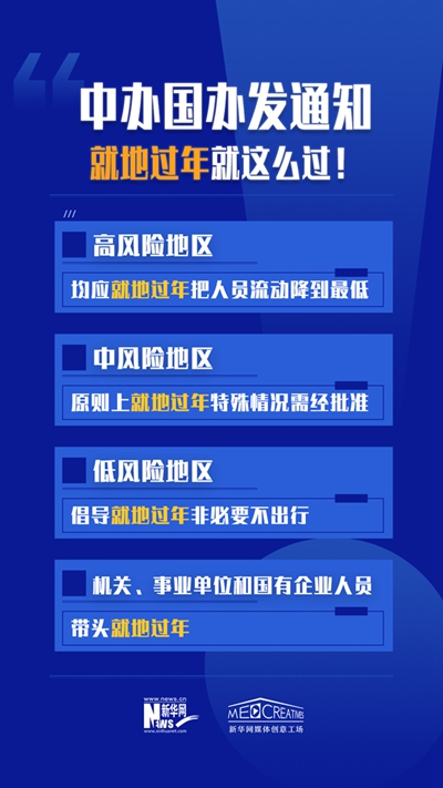 高、中、低风险地区如何合理有序引导群众就地过年?如何加强就地过年群众生活保障,让就地也能过个好年?怎样保障就地过年群众工资休假等合法权益?记者梳理了此次两办文件中的有关要点。