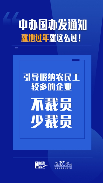 此次印发的通知明确:“指导企业稳定就地过年群众的劳动关系,规范用工行为,不得违法终止或解除劳动合同。在春节期间安排职工工作的,用人单位要依法支付加班工资。”为大家担心的“就地过年还是就地加班”等问题吃下“定心丸”。