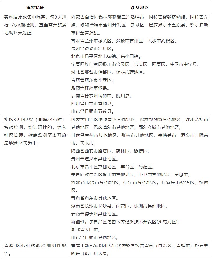 有本土新冠病例和无症状感染者报告省份(自治区、直辖市)旅居史的来(返)川人员,查验48小时核酸检测报告。