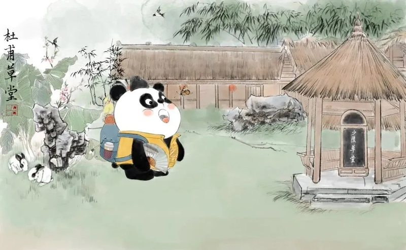 杜甫草堂:头戴帽子,手拿折扇,背包里装着笔墨纸砚,旅行熊猫来到杜甫草堂。茅屋与绿竹相映成趣,我们在这里聆听“诗圣”的沉郁顿挫,感怀“大庇天下寒士俱欢颜”的家国之思。