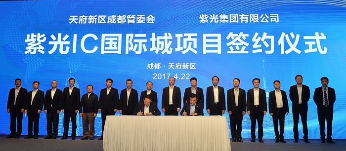 距成都市政府与紫光集团签署合作框架协议4个多月后,4月22日,天府新区成都管委会与紫光集团有限公司在成都正式签署紫光IC国际城项目合作协议。省委副书记、省长尹力,紫光集团董事长赵伟国共同见证项目签约。