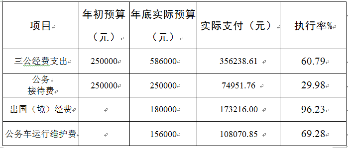 “三公”经费支出情况:“三公”经费预算58.6万元,实际支付356238.61元。其中公务接待费预算25万元,实际支付74951.76元,接待29批360人;因公出国(境)费预算18万元,实际支付173216元,组团2次人数3人;公车运行维护费预算15.6万元,实际支付108070.85元。