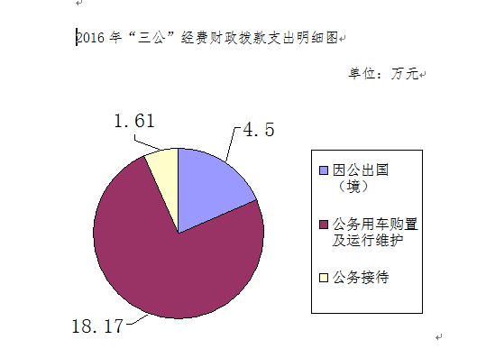 2016年度“三公”经费财政拨款支出决算中,因公出国(境)费支出决算4.5万元,占“三公”支出18.53%;公务用车购置及运行维护费支出决算18.17万元,占“三公”支出74.84%;公务接待费支出决算1.61万元,占“三公”支出6.63%。具体情况如下(如图所示):