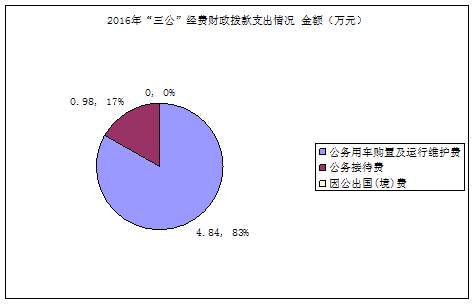 2016年度“三公”经费财政拨款支出决算中,无因公出国(境)费;公务用车购置及运行维护费支出决算4.84万元,占83%;公务接待费支出决算0.98万元,占17%。具体情况如下: