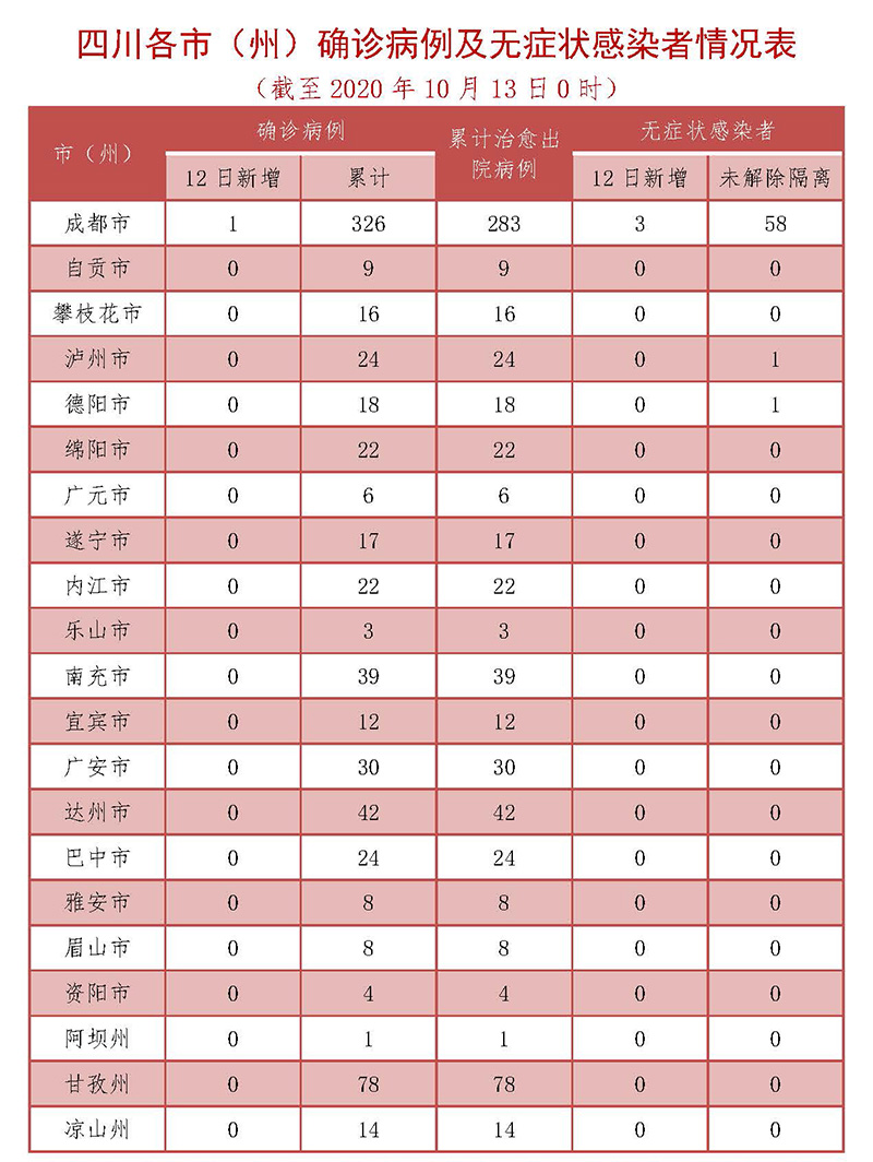 四川省新型冠状病毒肺炎疫情最新情况(10月13日发布)