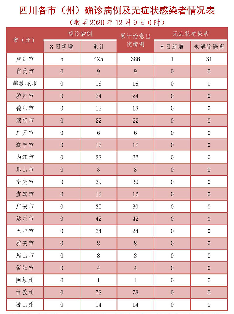 四川省新型冠状病毒肺炎疫情最新情况(12月9日发布)
