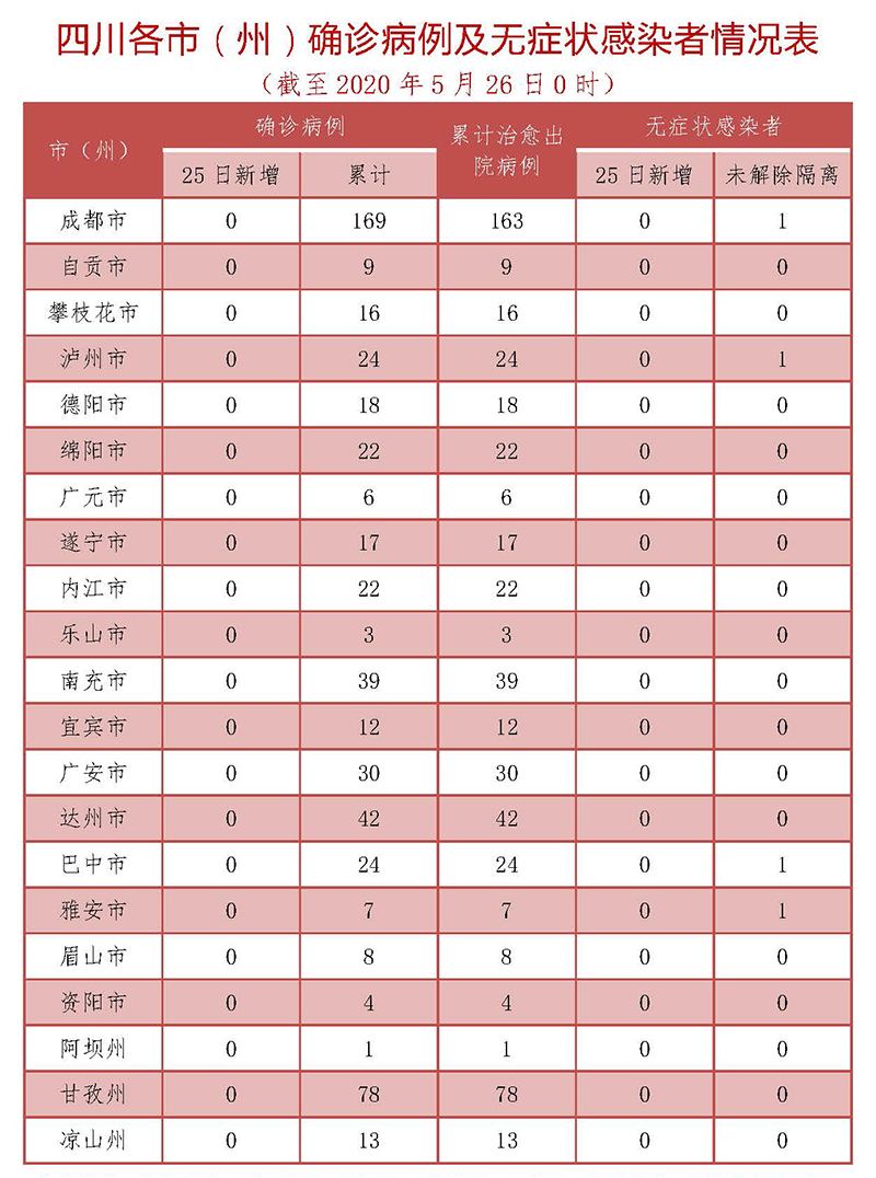 四川省新型冠状病毒肺炎疫情最新情况(5月26日发布)