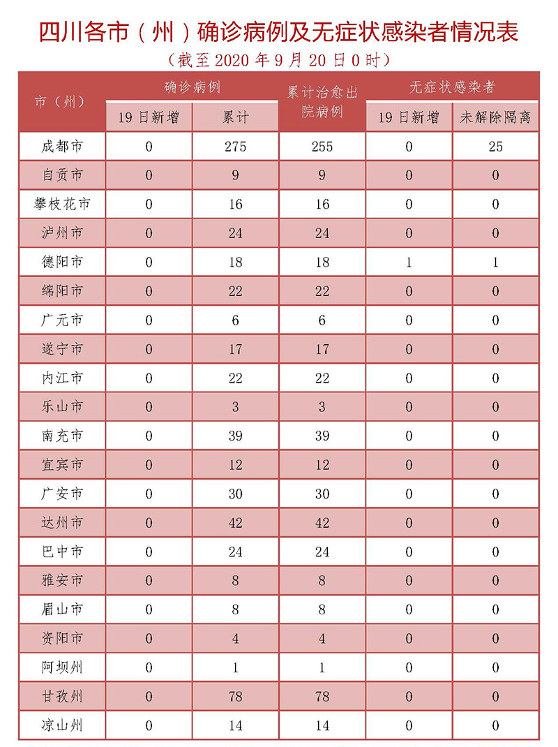四川省新型冠状病毒肺炎疫情最新情况(9月20日发布)