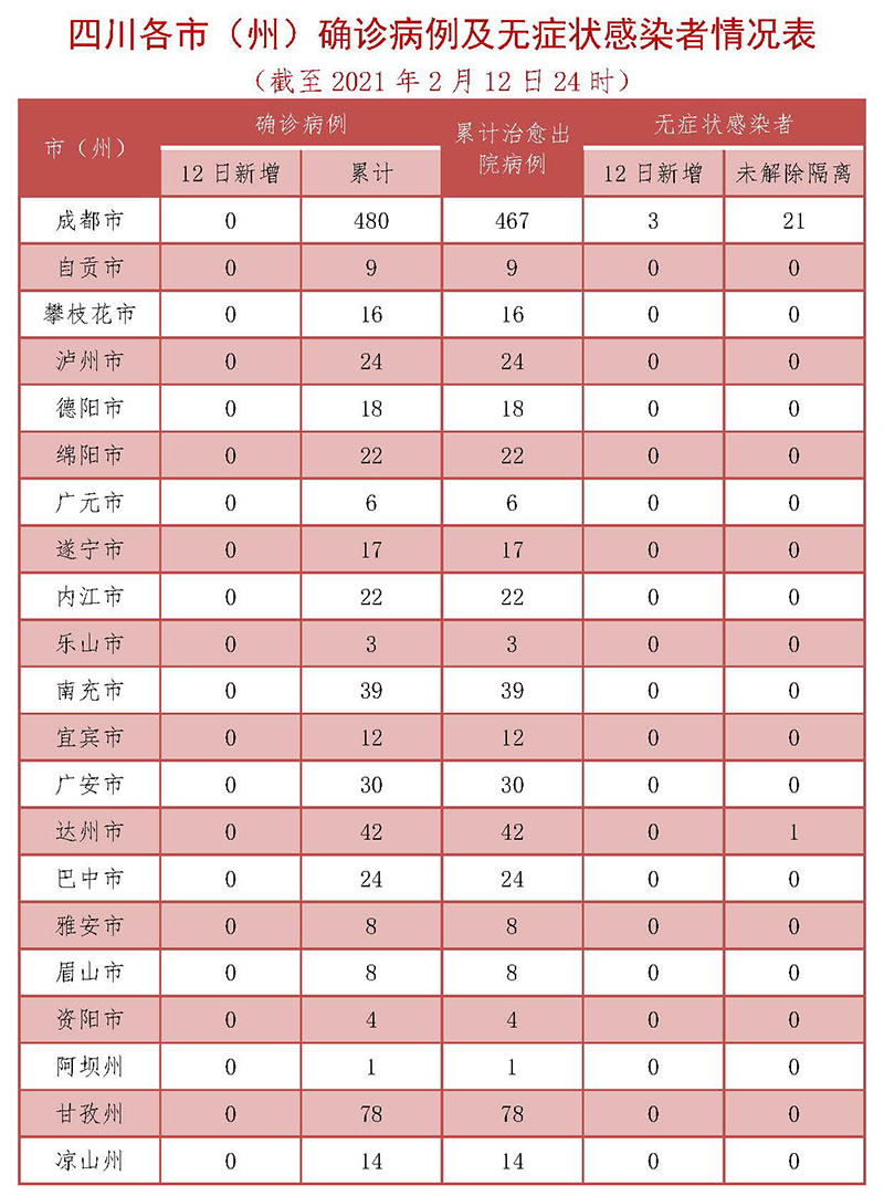 2月12日0-24时,四川无新增新型冠状病毒肺炎确诊病例,无新增治愈出院病例,无新增疑似病例,无新增死亡病例。